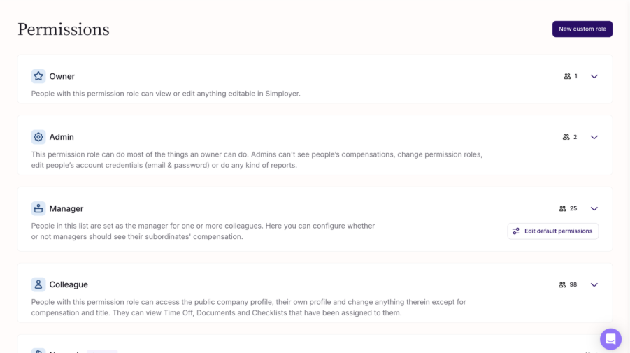There are four different permission levels - Owner, Admin, Manager, and Colleague. Keep in mind that you can be both an Owner and Manager or an Admin and Manager in Simployer One. Only Owners are allowed to set permissions in Simployer One!