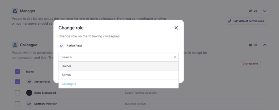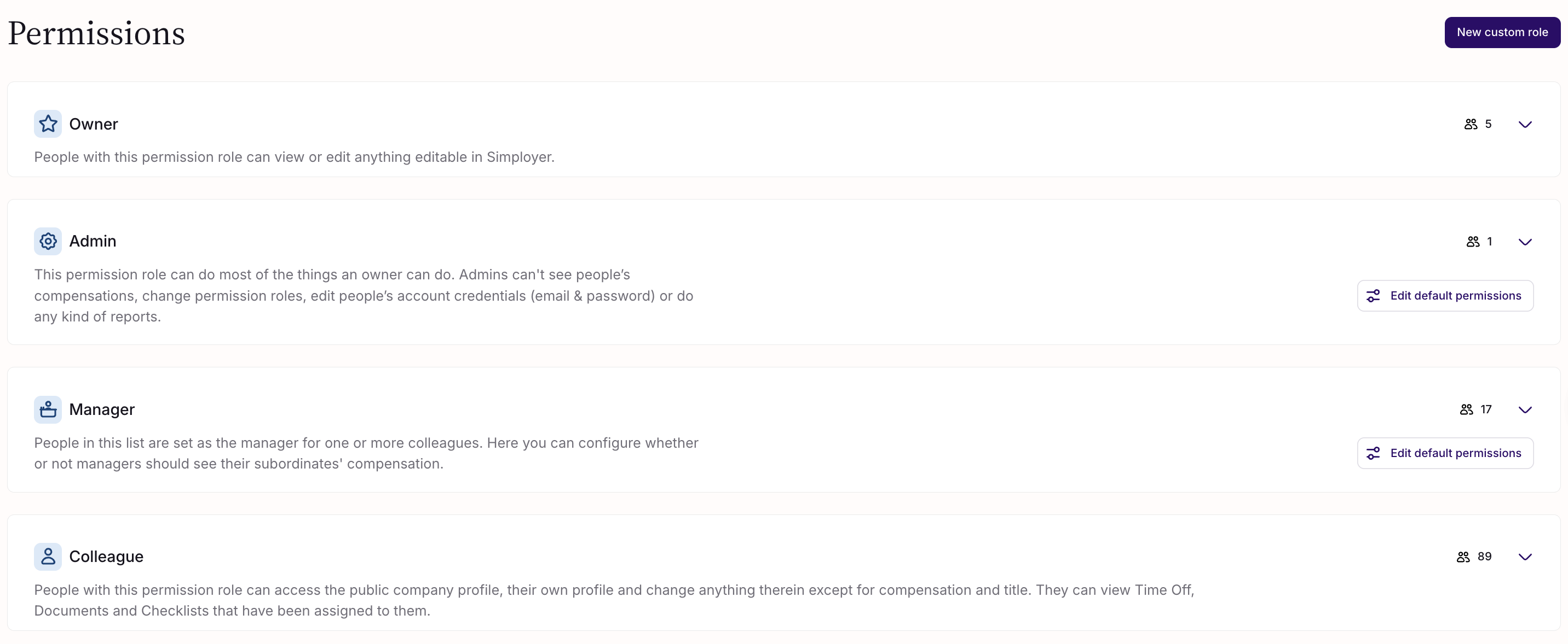 There are four default permission levels - 1) Owner, 2) Admin, 3) Manager, and 4) Colleague.