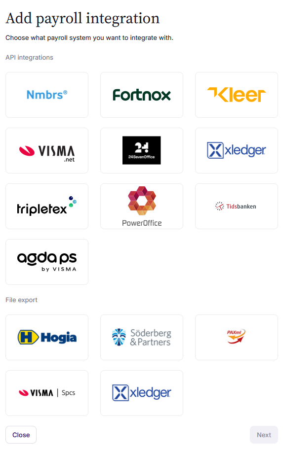 The integration is activated from Settings → Integrations → Select payroll system → Add integration