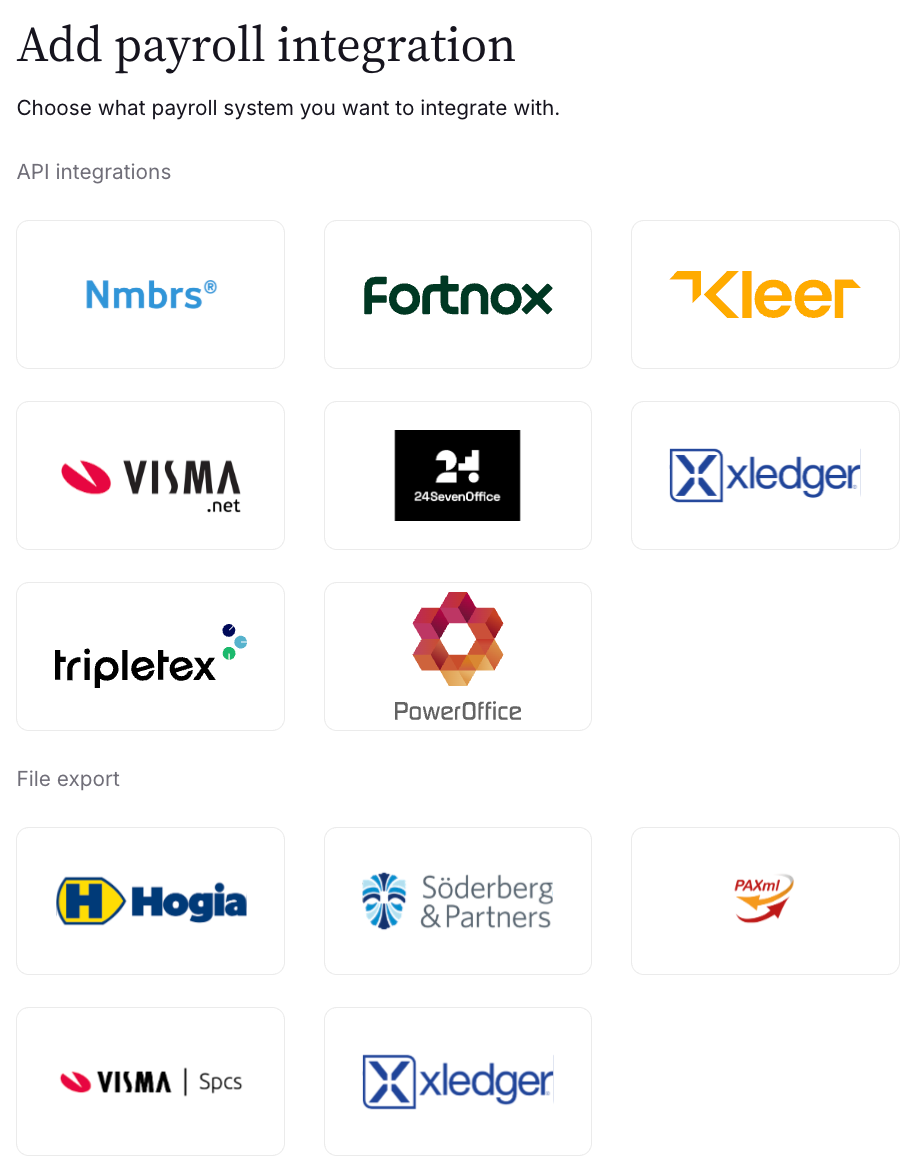 The integration is activated from Settings → Integrations → Select payroll system → Add integration