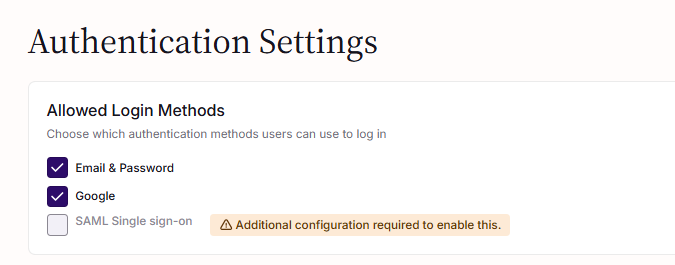 - Warning: If all login methods are disabled (including SAML when it's not configured), a warning message will appear before saving. This will prevent all users from logging in.