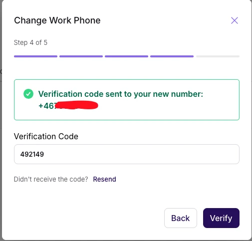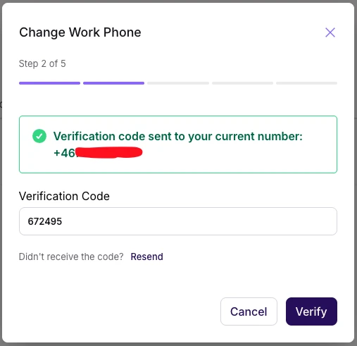 When Multi-Factor Authentication (MFA) is enabled for your organization, changing a work phone number uses a separate, dedicated flow with phone verification. This document describes the behaviour from a customer perspective.