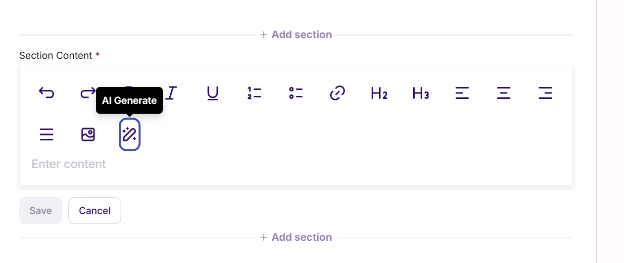 AI-powered content creation: Handbook Admins can generate articles by prompting directly within a section.