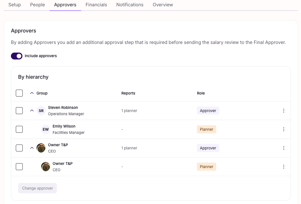 The approval process now supports an optional additional approver, positioned between the planner and the final approver. This is useful for organisations that require an extra level of oversight — for example, from an HR representative — before salary changes are finalised.