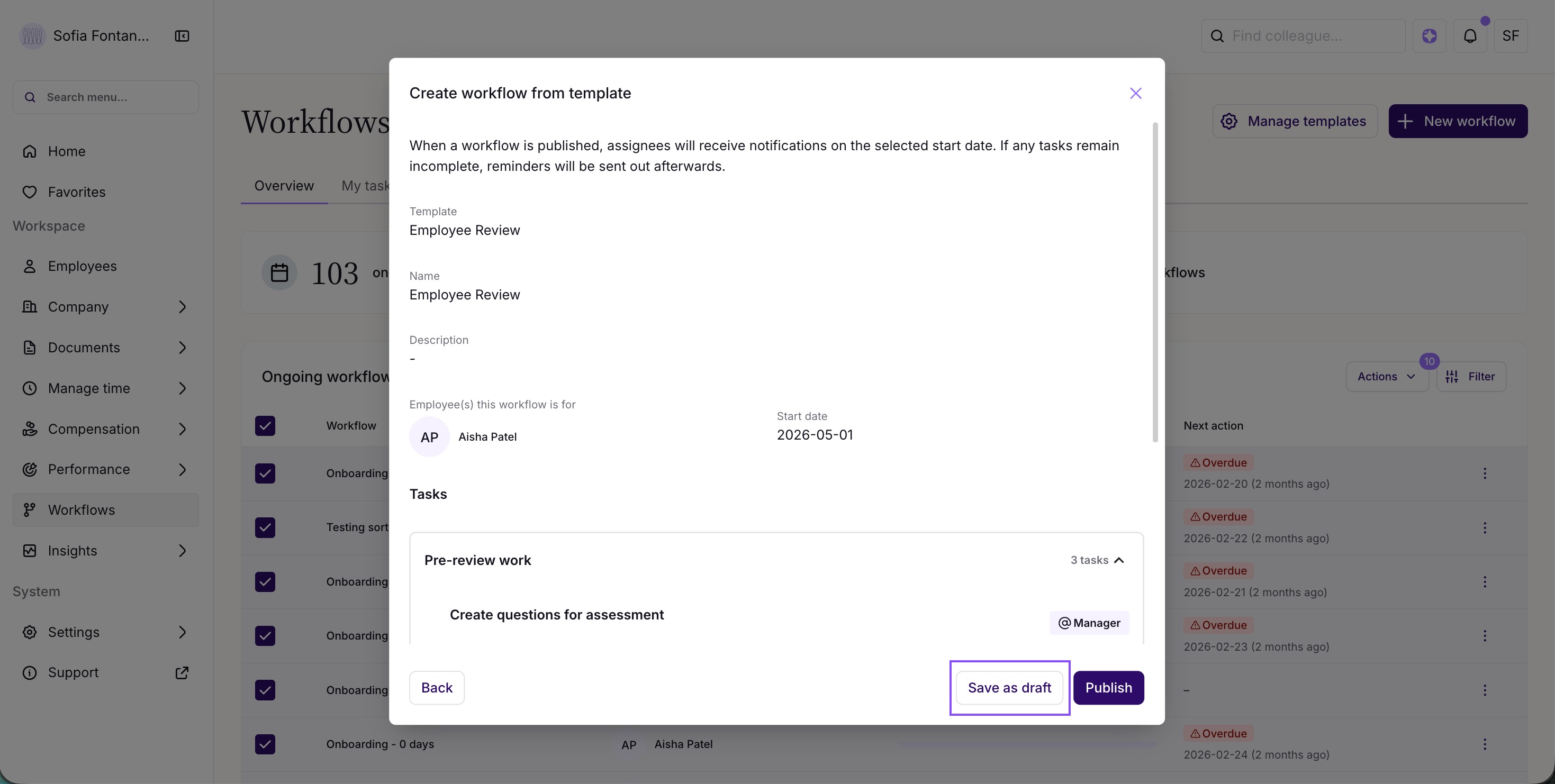 Draft workflows appear in a dedicated table at the bottom of the Workflow Overview tab. If there are no drafts, the table stays hidden. From there, HR admins can publish or discard drafts whenever they're ready.
