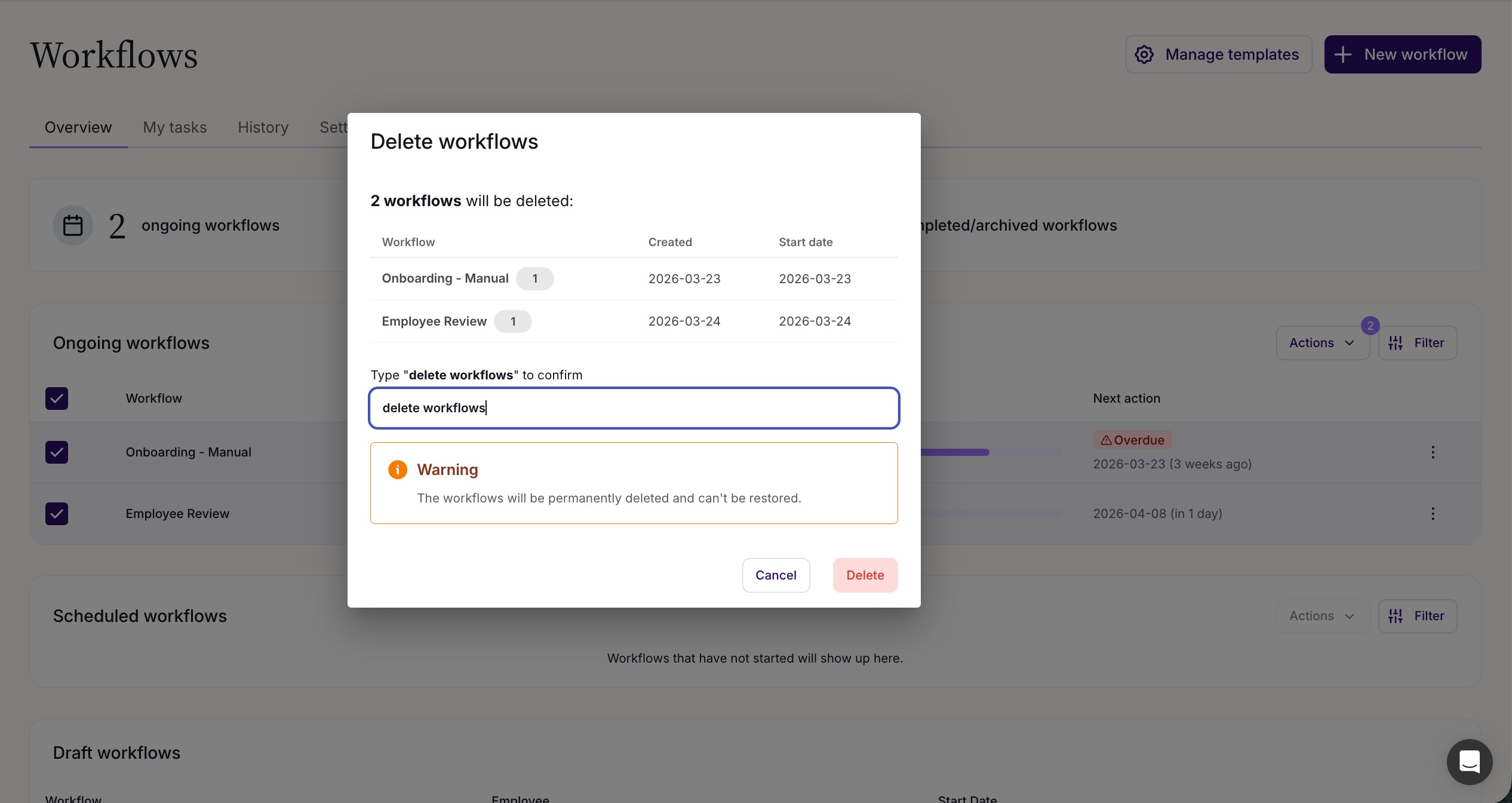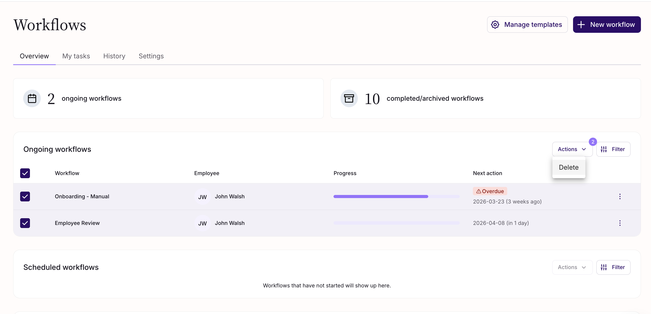 HR admins and owners can now select and delete multiple workflows at once. This is particularly useful when workflows are triggered incorrectly — sometimes in large volumes — removing the need to delete them one by one or reach out to Support.