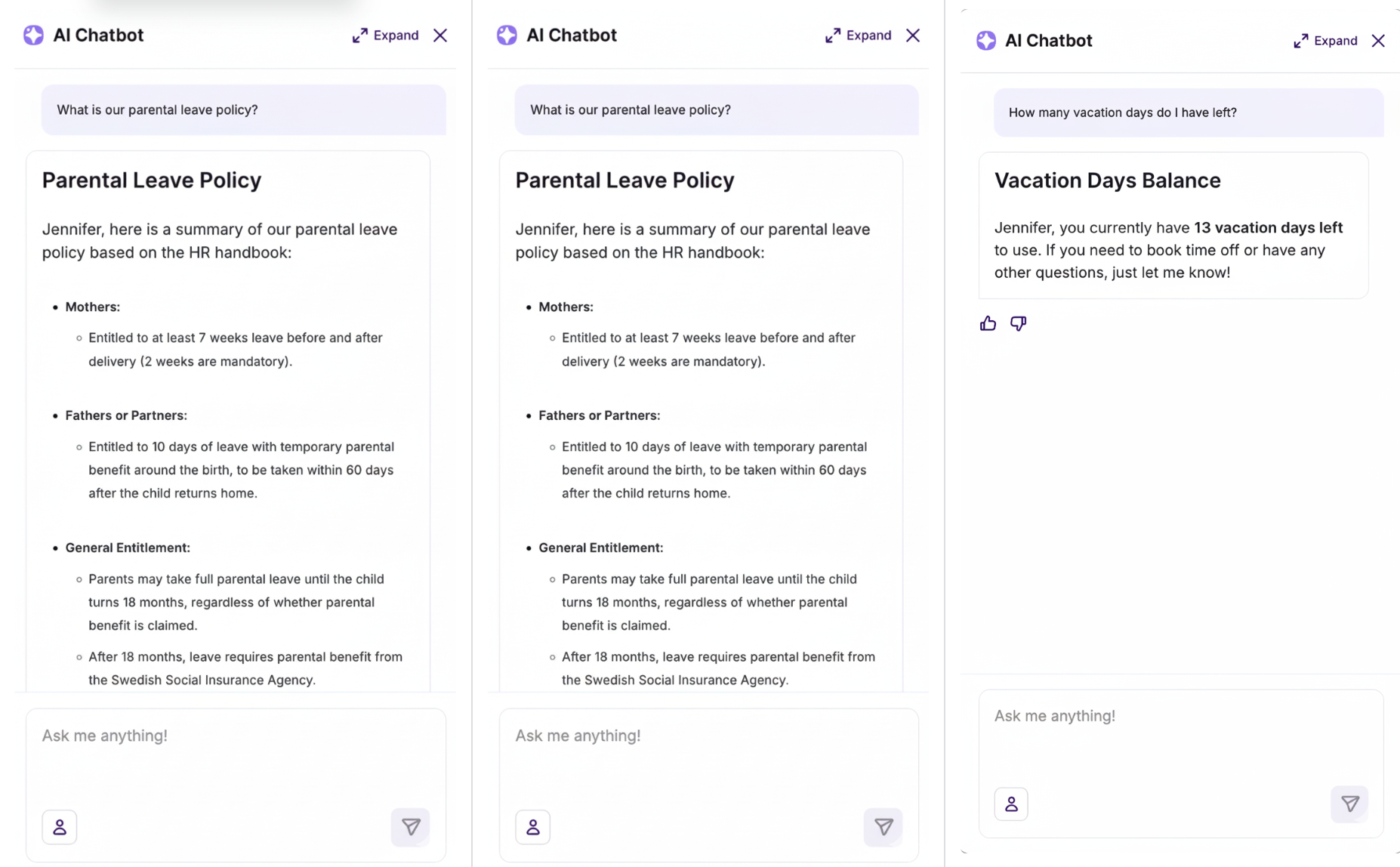 "Gi meg en 360-graders oversikt: Hvem er min leder, hva er min avdeling, hva er hovedmålene mine fra siste samtale, og hvor mange feriedager har jeg igjen?"