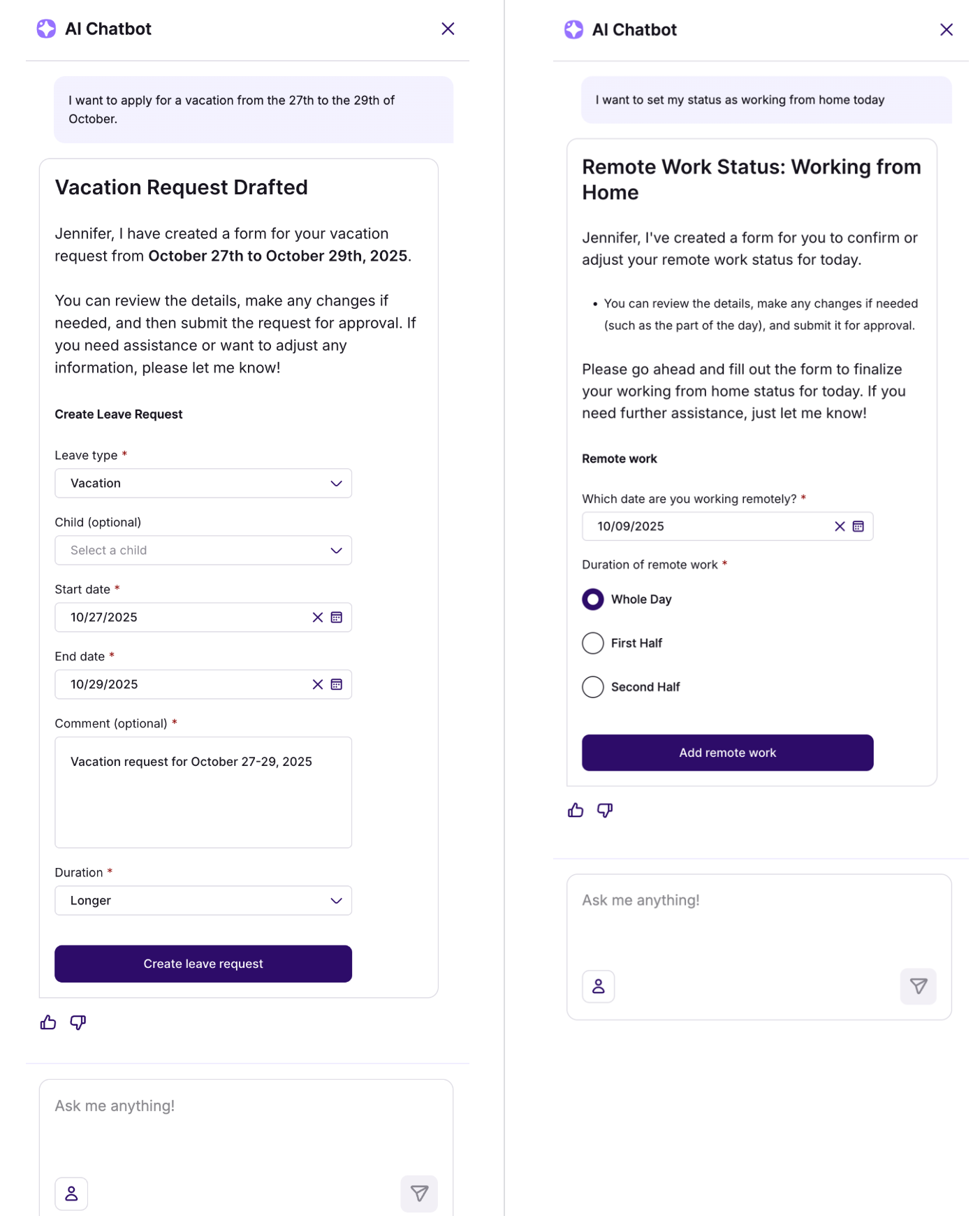 Sia kan hjelpe deg med vanlige HR-aktiviteter som å søke om ferie, registrere fravær, sjekke feriesaldo, angi arbeidsstatus og få tilgang til ansatt- eller organisasjonsinformasjon.
