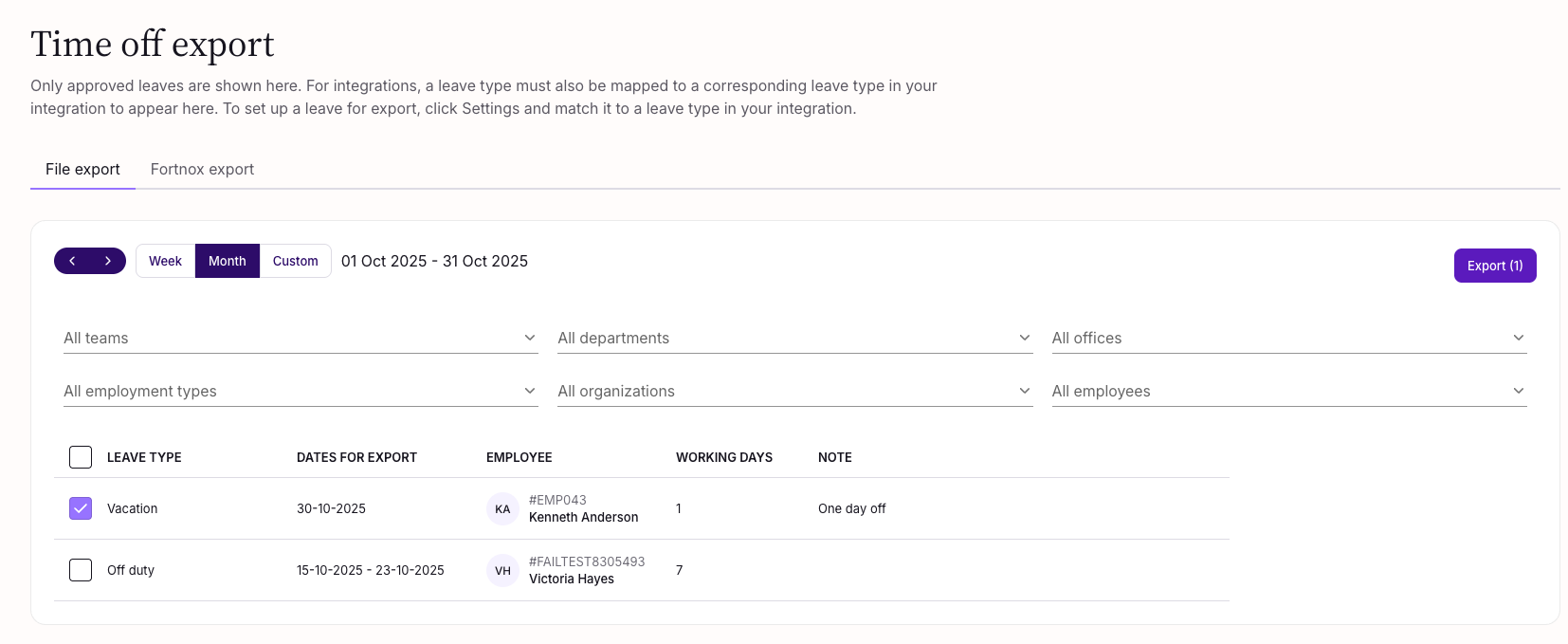 Note: Fraværsdata (som sykefravær eller foreldrepermisjon) må eksporteres separat via Manage time → Time off Export. Disse dataene er ikke inkludert i den planlagte eller manuelle ansattsynkroniseringen.