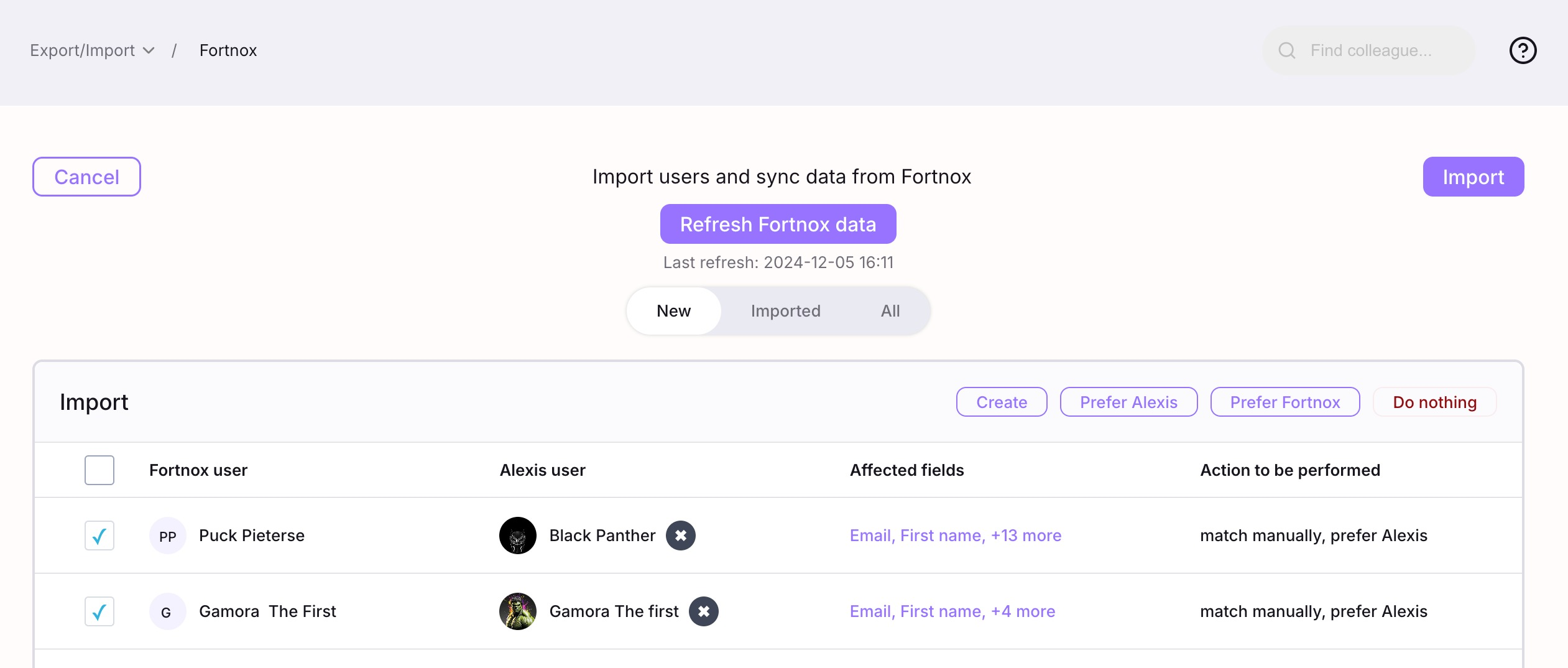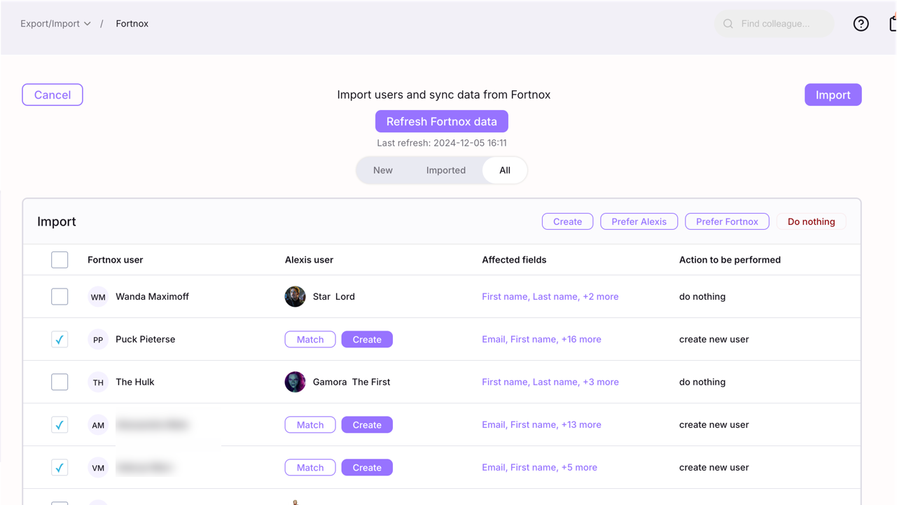 Velg de ansatte med avkrysningsboksene og klikk på Prefer Fortnox-knappen.