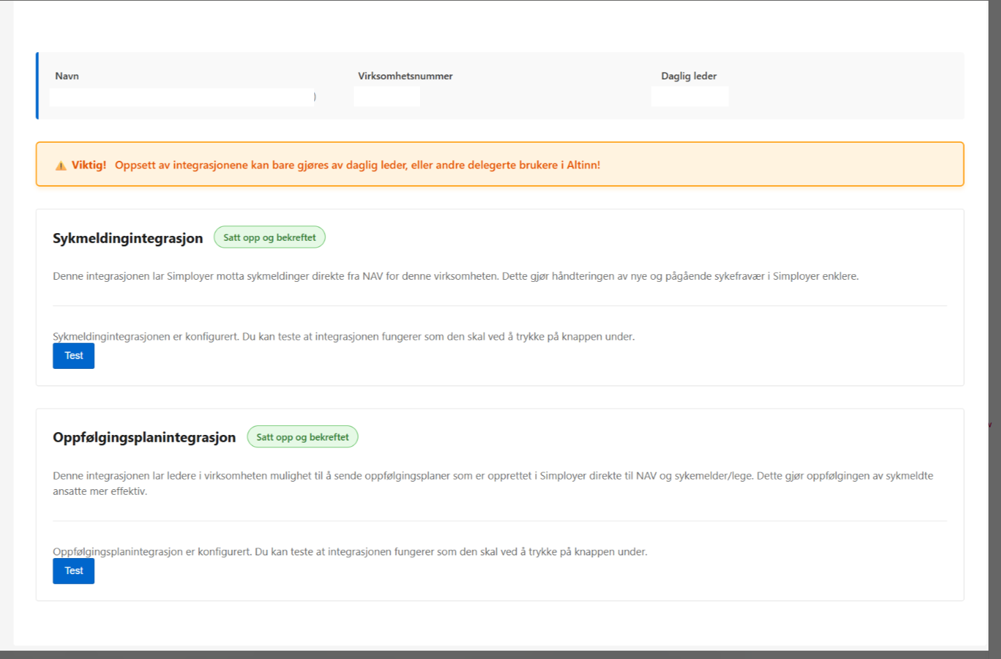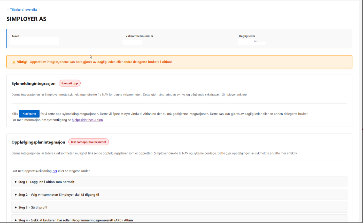 3. Når daglig leder er innlogget, vil portalen vise et brukervennlig grensesnitt som leder deg gjennom aktiveringsprosessen. Dette innebærer å knytte virksomheten til den nye funksjonaliteten for mottak av digitale sykmeldingsvarsler og innsending av oppfølgingsplaner.