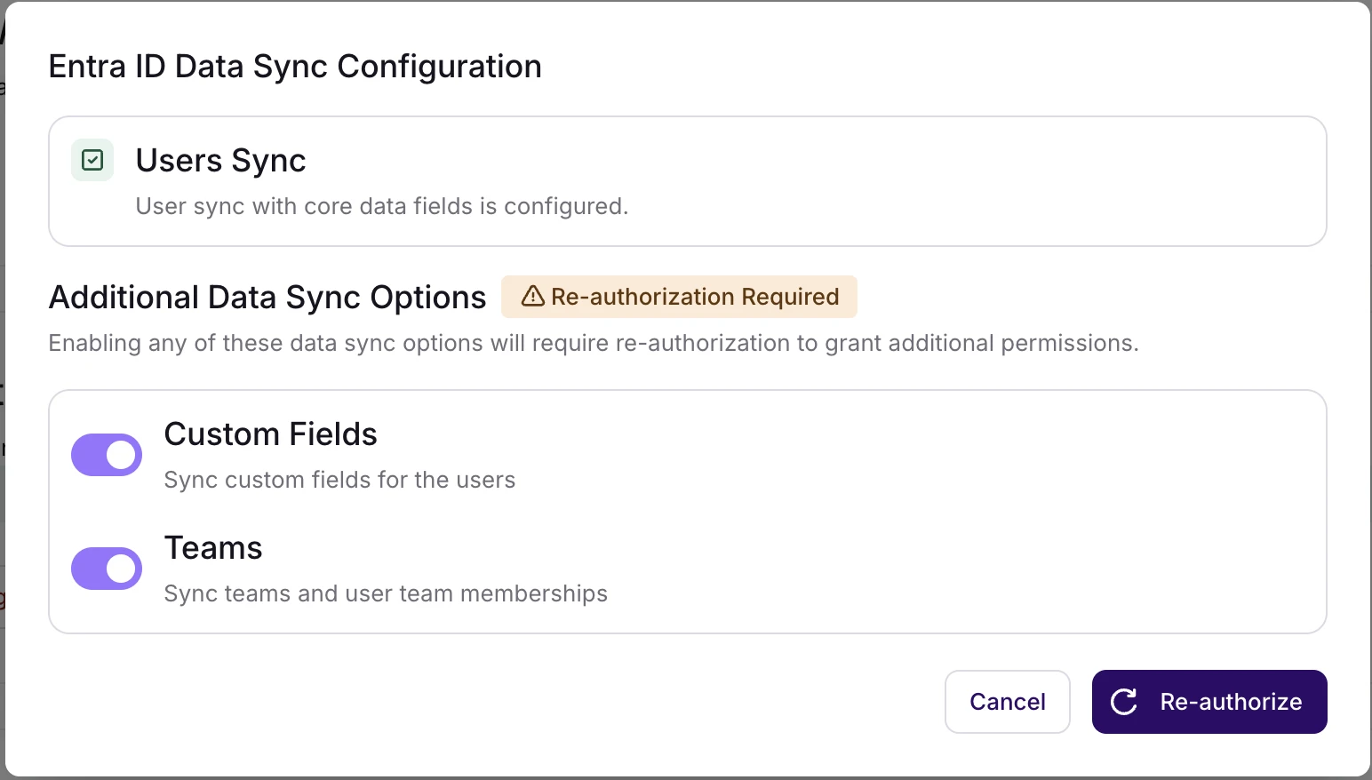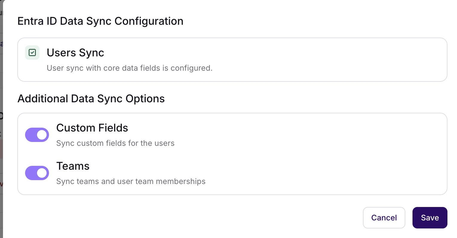Microsoft Entra ID-integrasjonen støtter nå flere synkroniseringsalternativer utover kjernebrukersynkronisering. Du kan valgfritt aktivere: