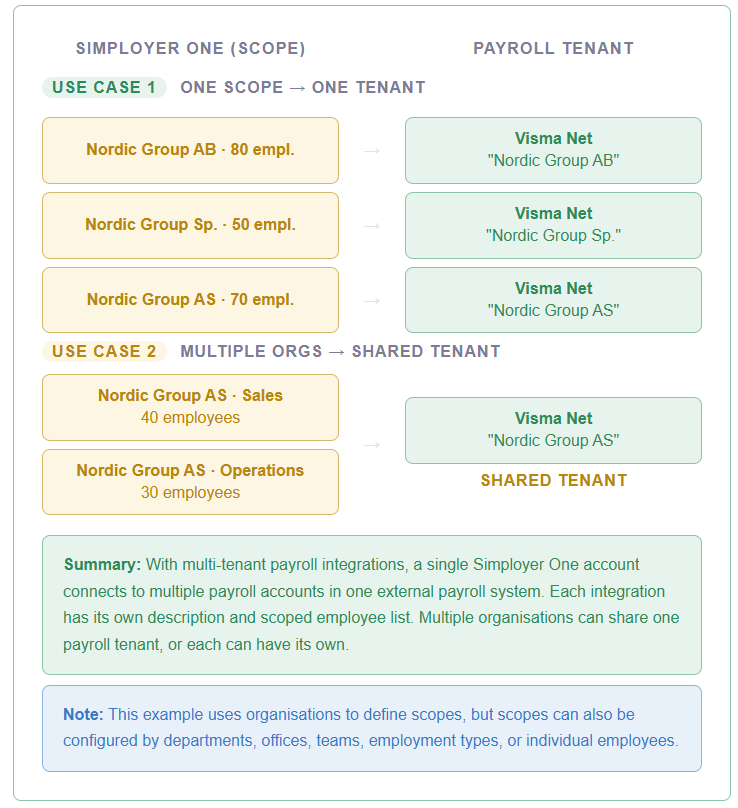 Med multi-tenant lønnsintegrasjoner kan én Simployer One-konto kobles til flere lønnskontoer i ett eksternt lønnssystem. Hver integrasjon har sin egen beskrivelse og et definert ansattomfang. Flere organisasjoner kan dele én lønnstenant, eller hver organisasjon kan ha sin egen.