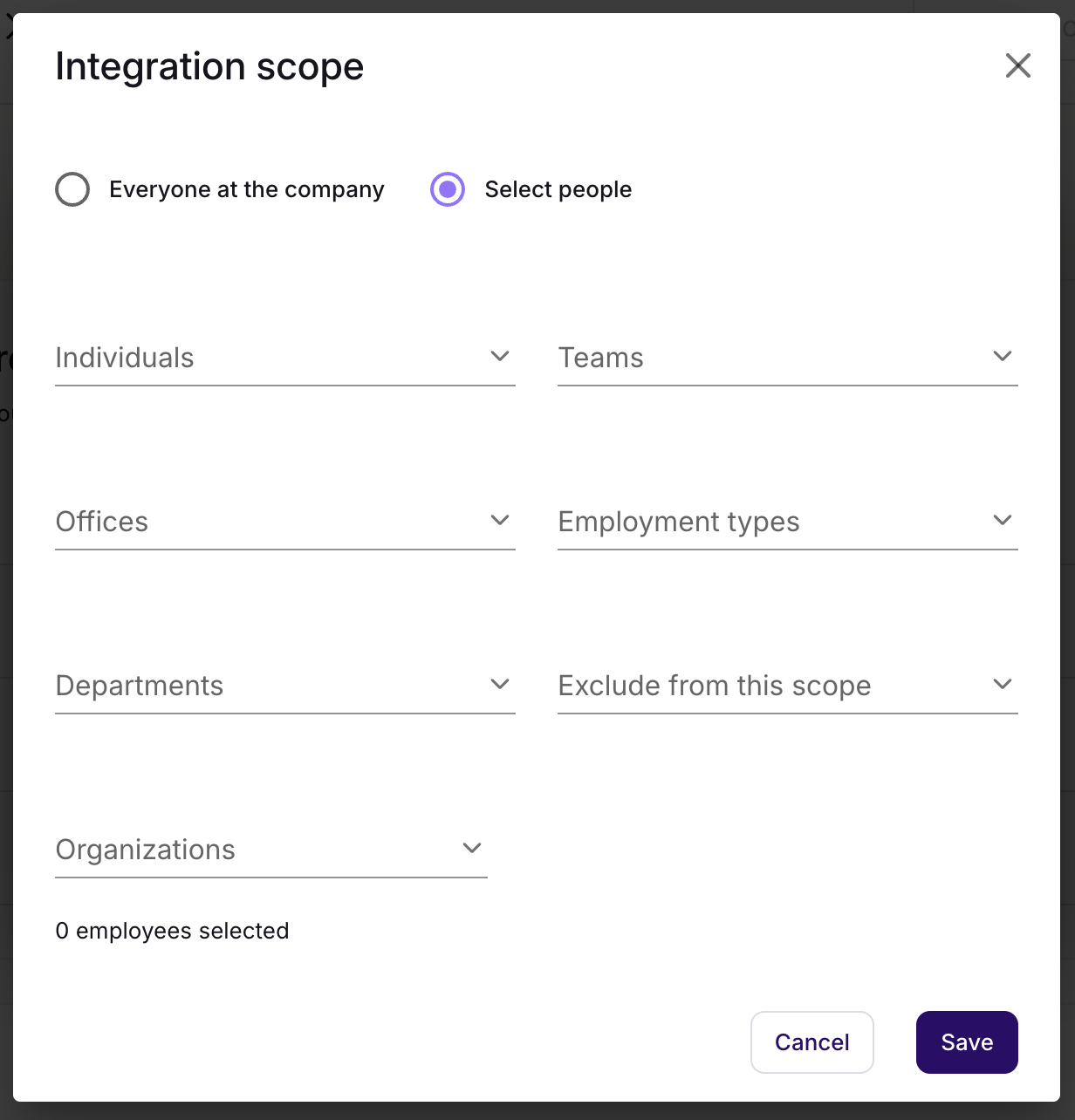 Definer hvilke ansatte som skal synkroniseres med denne lønnstenanten. Velg Everyone at the company eller Select people for å filtrere ved hjelp av tilgjengelige scope-alternativer.