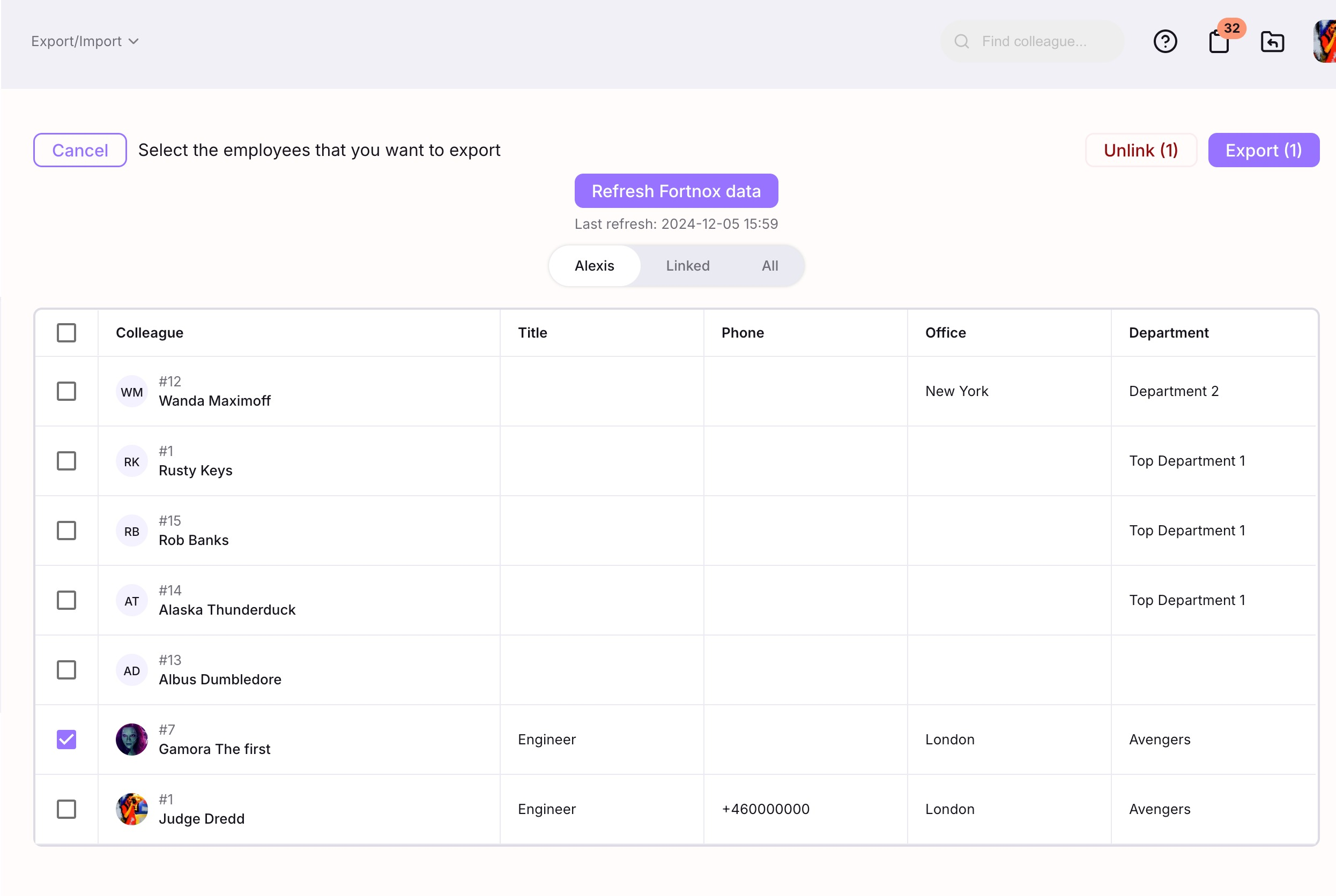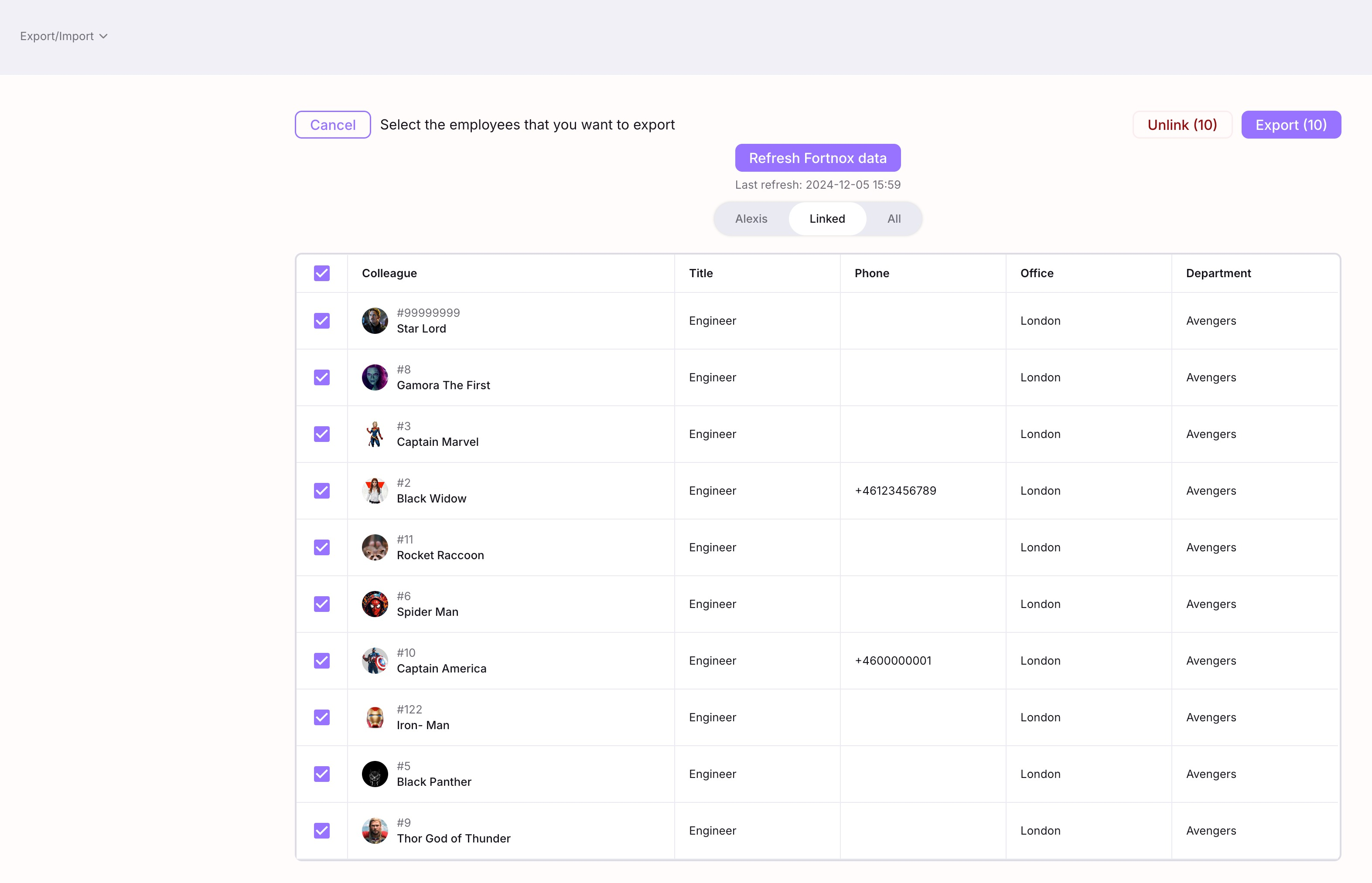 Exportera: Välj alla eller en delmängd av länkade anställda och "uppdatera" dem i Fortnox.